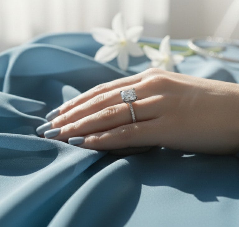 I bought this as an engagement ring for my wife and absolutely love the sparkle of the moissanite — it looks just like a diamond. My fiancée has very sensitive skin, and after 6 months of wearing it daily, she hasn’t had a single issue or complaint